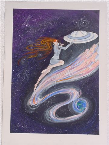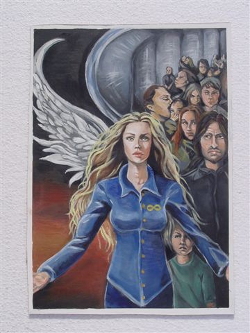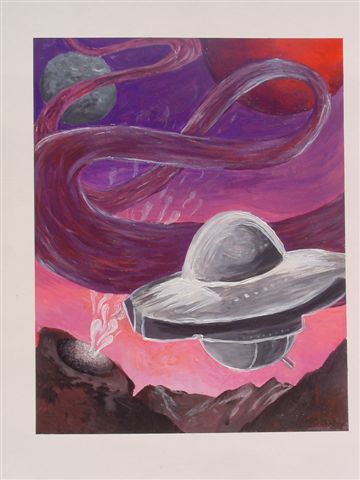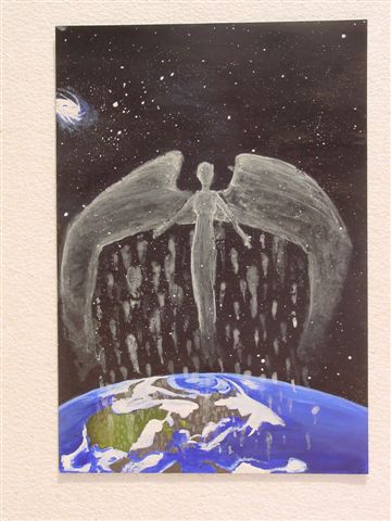 Since we emphasize words over pictures and usually have just one illustration, our digest format doesn't allow us many opportunities to work with new artists. The July cover depicting a a jouster and a dragon was a rare exception---that piece was the work of a new Australian artist named Shane Parker. Anyway, a few months back, Ron Walotsky mentioned that last time he taught art at Flagler College in St. Augustine, Florida, he gave his students an assignment of illustrating an F&SF story ("The Island in the Lake," I think it was) and then he showed them the cover illustration he created. Why not try it again? So I sent Ron an advance copy of "The Majesty of Angels" and of the eighteen pieces of art that resulted, we selected the work (at right) of Jenny Kerr, an undergraduate from Taylor Mill, Kentucky. Several of the other pieces gave it good competition---you can see all the work by Ron's students on our Website at www.fandsf.com. It's interesting to note how the professional painting we commissioned, David Hardy's fine work on our front cover, incorporates almost all of the same elements that the students picked out. ---GVG Click on a painting to see a larger version. |